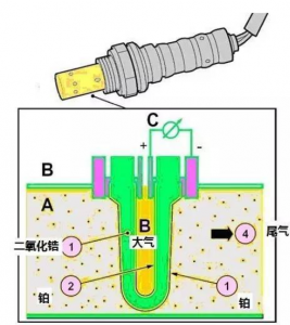導(dǎo)人排刺進(jìn)排氣管中,它的內(nèi)外表與空氣相通,外外表與廢氣相通。鋯管的內(nèi)、外外表掩蓋一層多孔性鉑膜作電極,為避免廢氣腐蝕鉑膜,在鋯管外外表的鉑膜層上掩蓋一層多孔陶瓷層,并有一個(gè)防護(hù)套管,套管上開有槽口或孔。